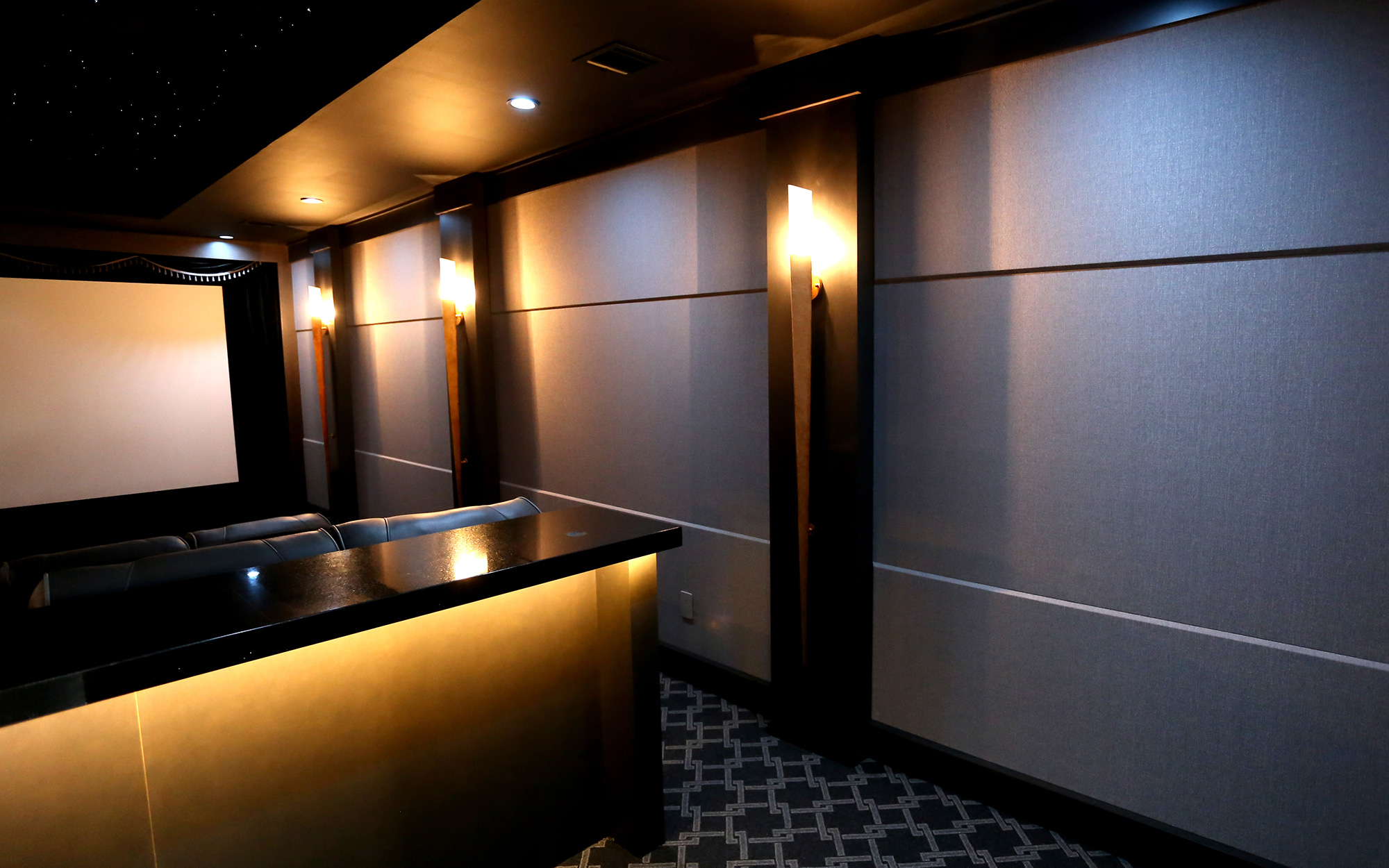 This project—two theaters from two clients who live right next door to each other—started three years ago. Both clients are friends and movie lovers, watching flicks several times a week. While the two theaters look different—one has a grey and black interior, the other uses an orange and red color scheme—the core technology is nearly identical.