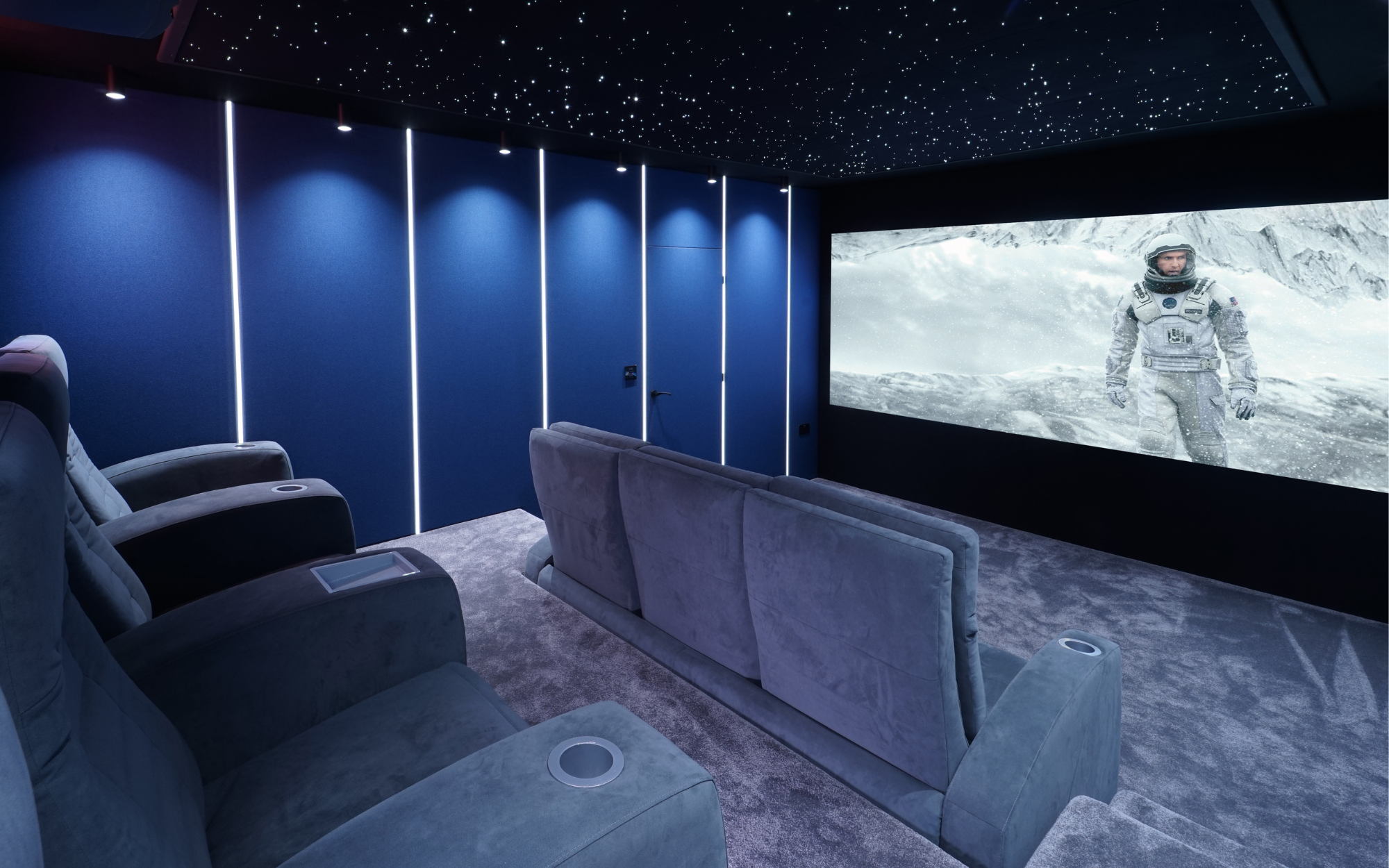 The Meridian system was installed alongside a Sony laser 4k projector, custom cinema seating in luxurious alcantara fabric, acoustic fabric walls, a star ceiling, plush carpet, and LED lighting features, all seamlessly automated by Control4 automation. The project was finalised with illuminated cinema lightboxes showcasing iconic film images, adding the perfect finishing touch to the cinematic theme.