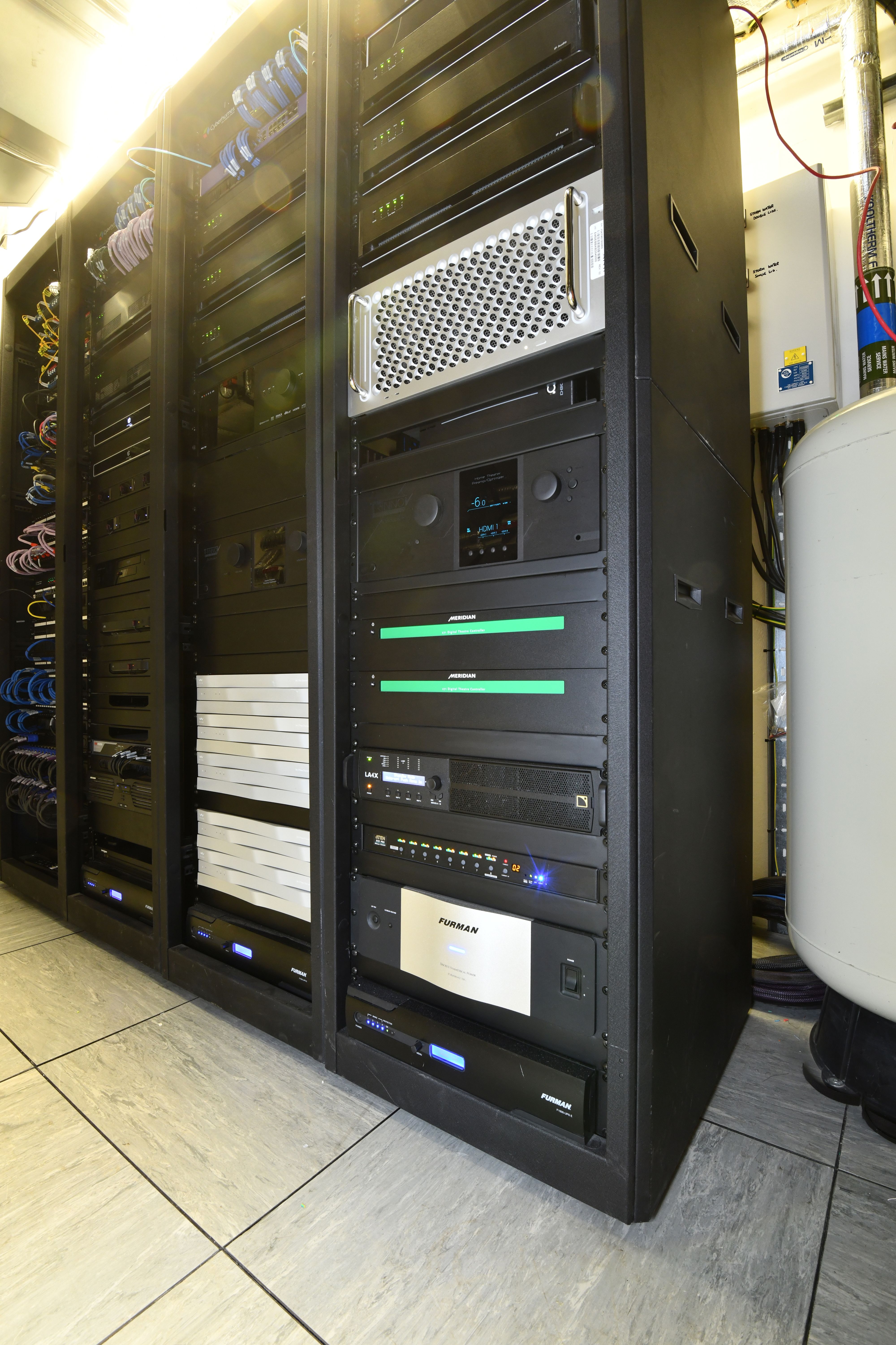 A pre-existing recess - housing cooling fans - falls in what would usually be the natural location for the second row of surround speakers. This meant that these speakers had to be positioned further forward. However this hurdle was overcome thanks to a combination of the wide horizontal dispersion of the Meridian speakers, the high speaker count and the advanced calibration settings offered by the Trinnov processor.
