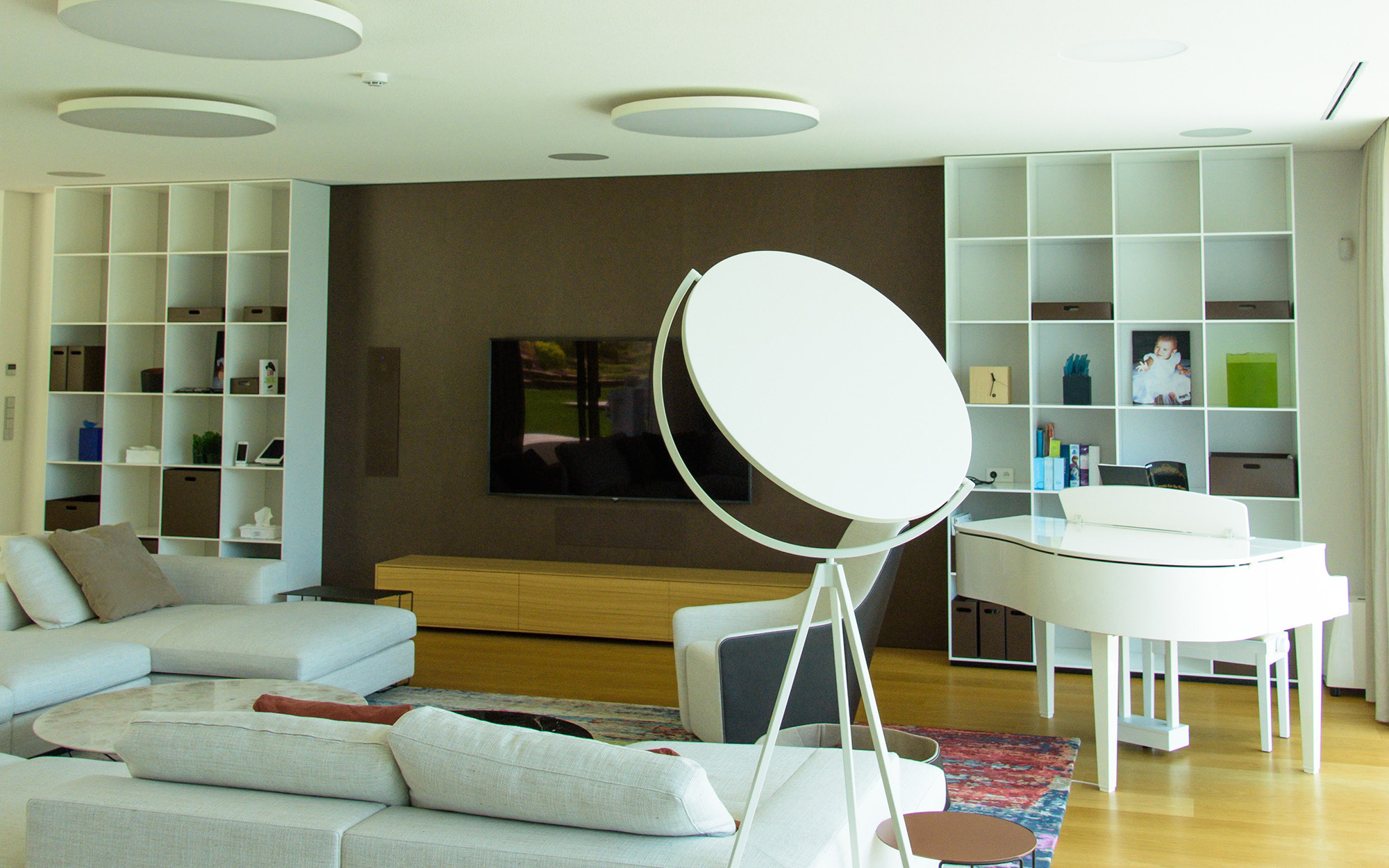 Ketos’s audiophile client had enjoyed the Meridian experience in a previous home. For this new property, designed by a renowned Czech architect with spectacular views of the city of Zlin in Southeastern Moravia, he wanted to repeat that same level of quality and enjoyment. This time, the challenge was to achieve that performance within a modernist interior shaped by curves, clean lines and open spaces.