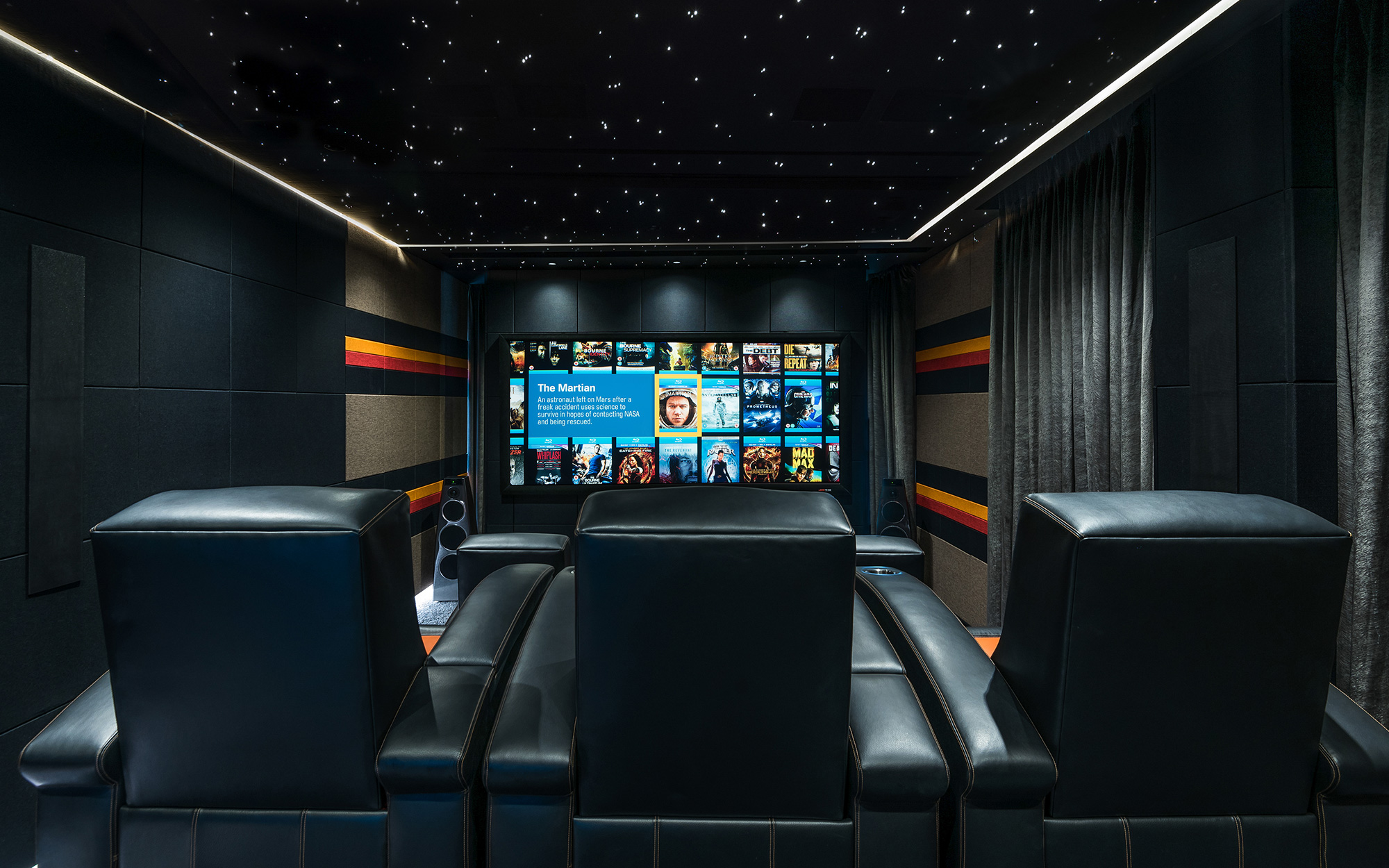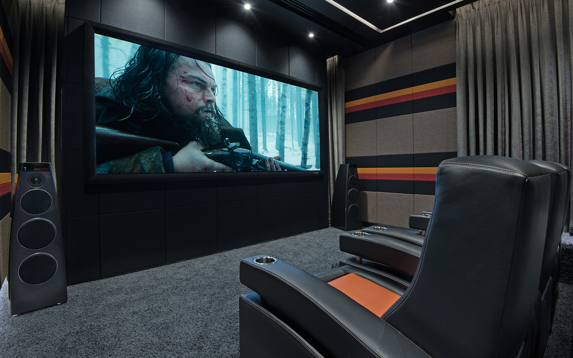 Four Meridian Select DSW DSP Subwoofers and the Special Edition DSP7200 HC centre channel speaker were concealed behind an acoustically invisible 4K screen. The homeowner’s affection for Meridian products meant that he was very keen to have them on show at the front of the theatre.