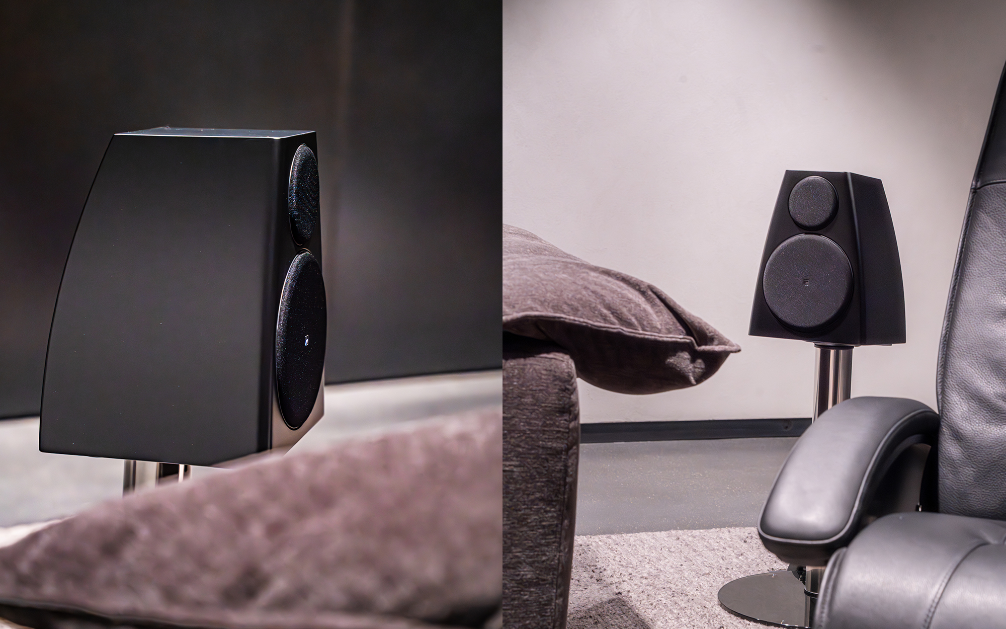 The Meridian DSP5200s feature a sleek, architectural design and are engineered with proprietary DSP technology for precise sound imaging and clarity. Their custom-built, high-rigidity cabinets and narrow profile complement the clean lines of the space while delivering a wide, immersive soundstage. At the rear, compact yet powerful DSP3200 loudspeakers on stands provide detailed rear-channel audio with Meridian’s signature DSP performance, ensuring no compromise in clarity or dynamics, despite their discreet footprint.