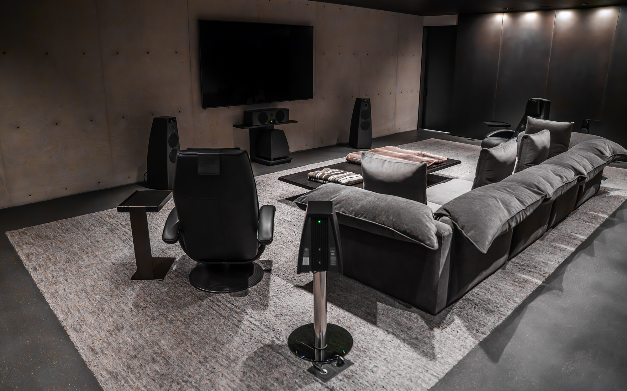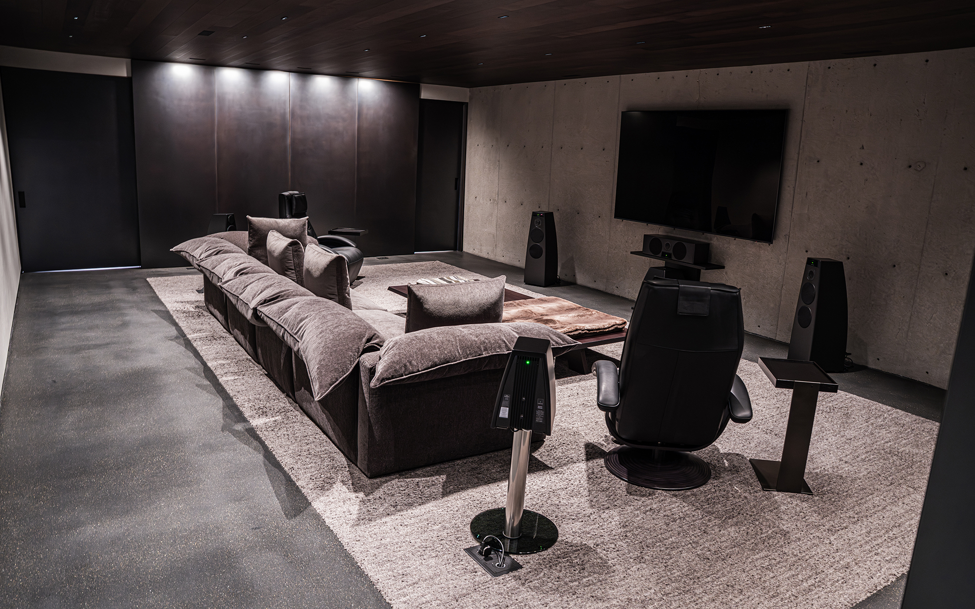The home’s concrete construction introduced challenges, both in terms of physical installation and acoustic treatment. With no cabinetry available, Spire Integrated Systems designed and fabricated a bespoke blackened steel shelf to house the centre channel below the screen. Cable routing had to be meticulously planned to avoid damaging structural elements.