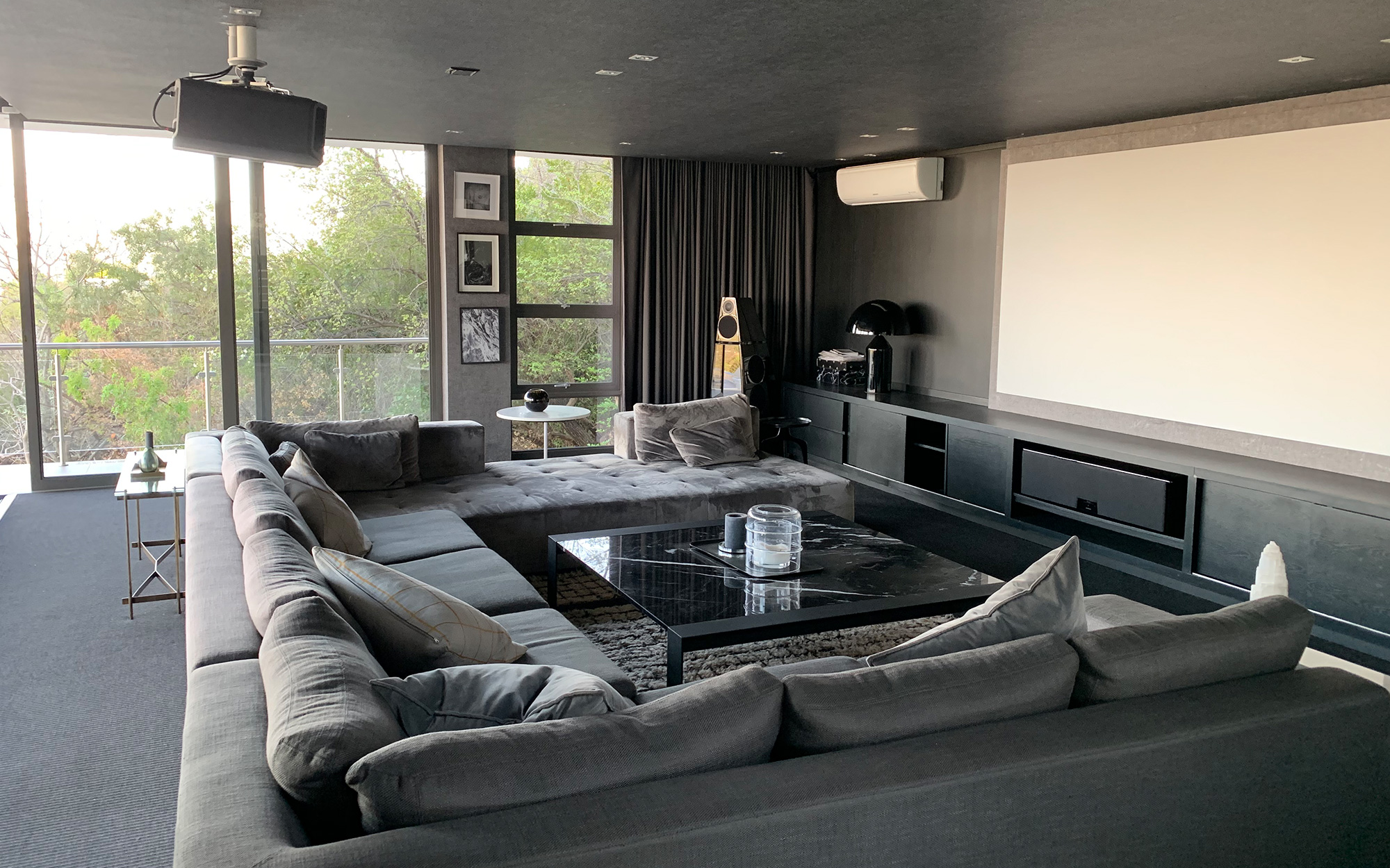 Complementing the audio system is a JVC projector, a large Stewart Filmscreen screen, Somfy blind control, and a Control4 control system all synchronising with the room’s modern interior.