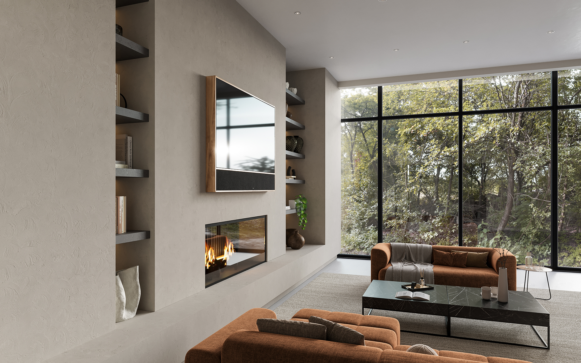 This practical on-wall solution combines Meridian's architectural loudspeakers with displays, integrating Meridian's audio technology with Leon's expertise in media frames to deliver high-quality sound and clean aesthetics.